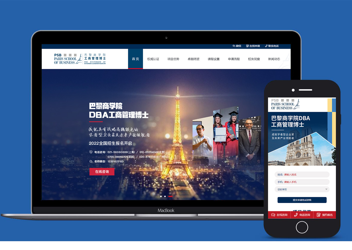 網站建設整體突出巴黎商學院品牌特點、介紹、用途,更具留學網站的特點,和重點突出。網站整體用色沿用LOGO的綠色色調為主色調,延展相似色調,更具形象的體現出學院的研究莊重。