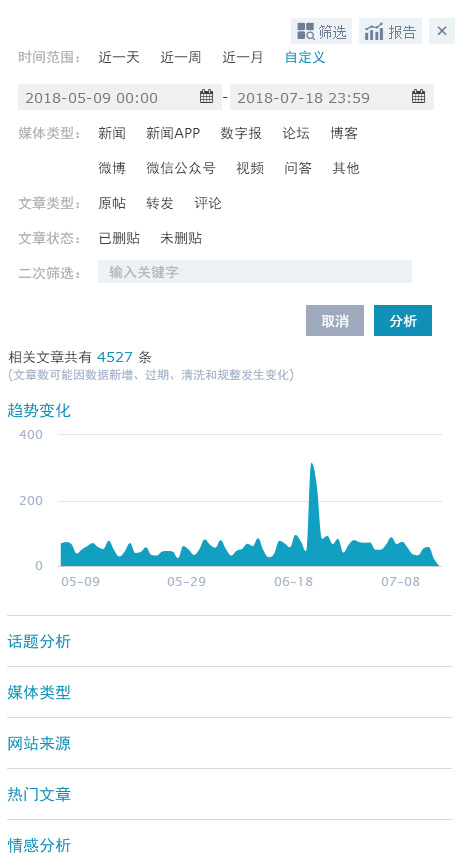 可自主設置每個主題2000字符以內的關鍵詞組合進行實時監測,自由修改,添加,刪除,信息實時同步刷新