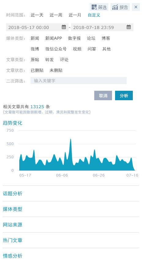 可自主設置每個主題2000字符以內的關鍵詞組合進行實時監(jiān)測,自由修改,添加,刪除,信息實時同步刷新