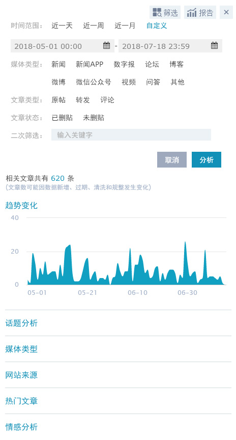 可自主設(shè)置每個主題2000字符以內(nèi)的關(guān)鍵詞組合進行實時監(jiān)測,自由修改,添加,刪除,信息實時同步刷新