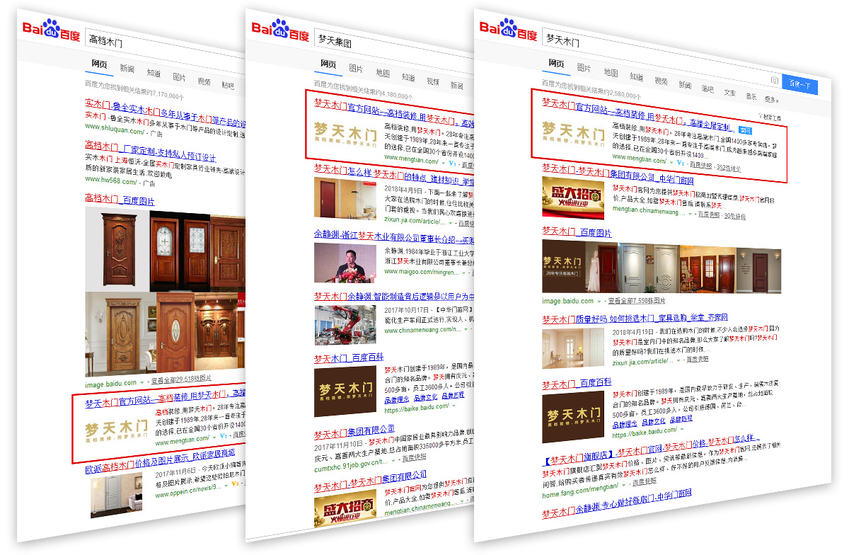 在前期的項目溝通和執行上,助騰團隊對此項目投入了空前的精力和創作熱情,針對夢天木門在互聯網上的口碑信息進行的全面的抓取和梳理。保證品牌在互聯網信息內容展示上能以更好的形象展示出來,同時結合競品投放信息和渠道進行分析,在相關競品可以觸及到的點上進行夢天木門的品牌信息曝光,提升網絡覆蓋面。