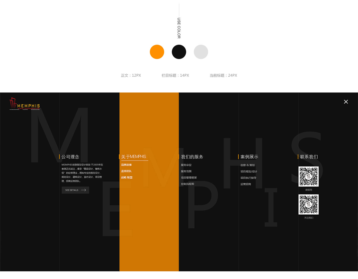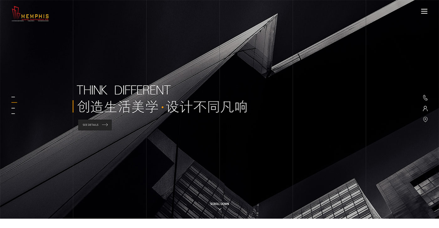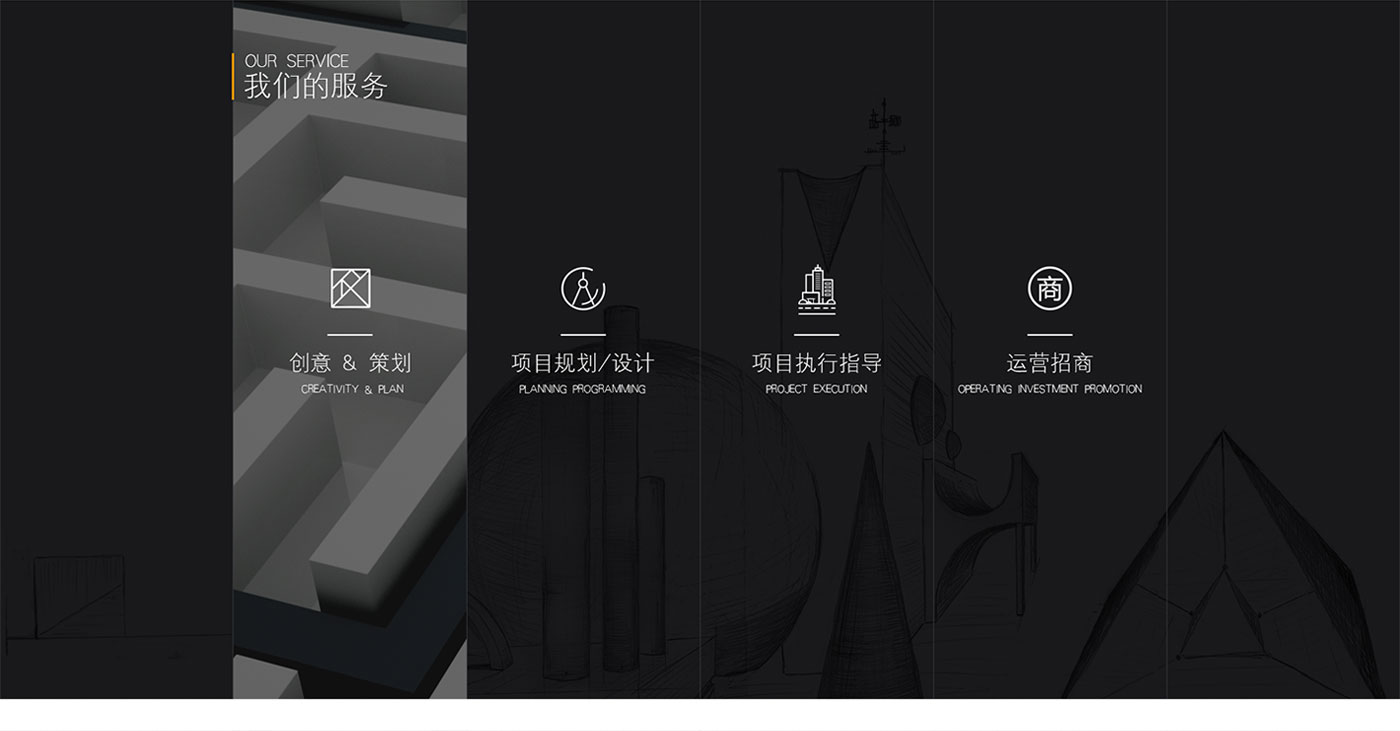 結合建筑設計行業特性,整體網站以線性進行輸出,黑色為主色掉,網站的LOGO黃色為輔助色。是整個網站看起來更加沉穩,同是黃色的點綴又多了一些生機。